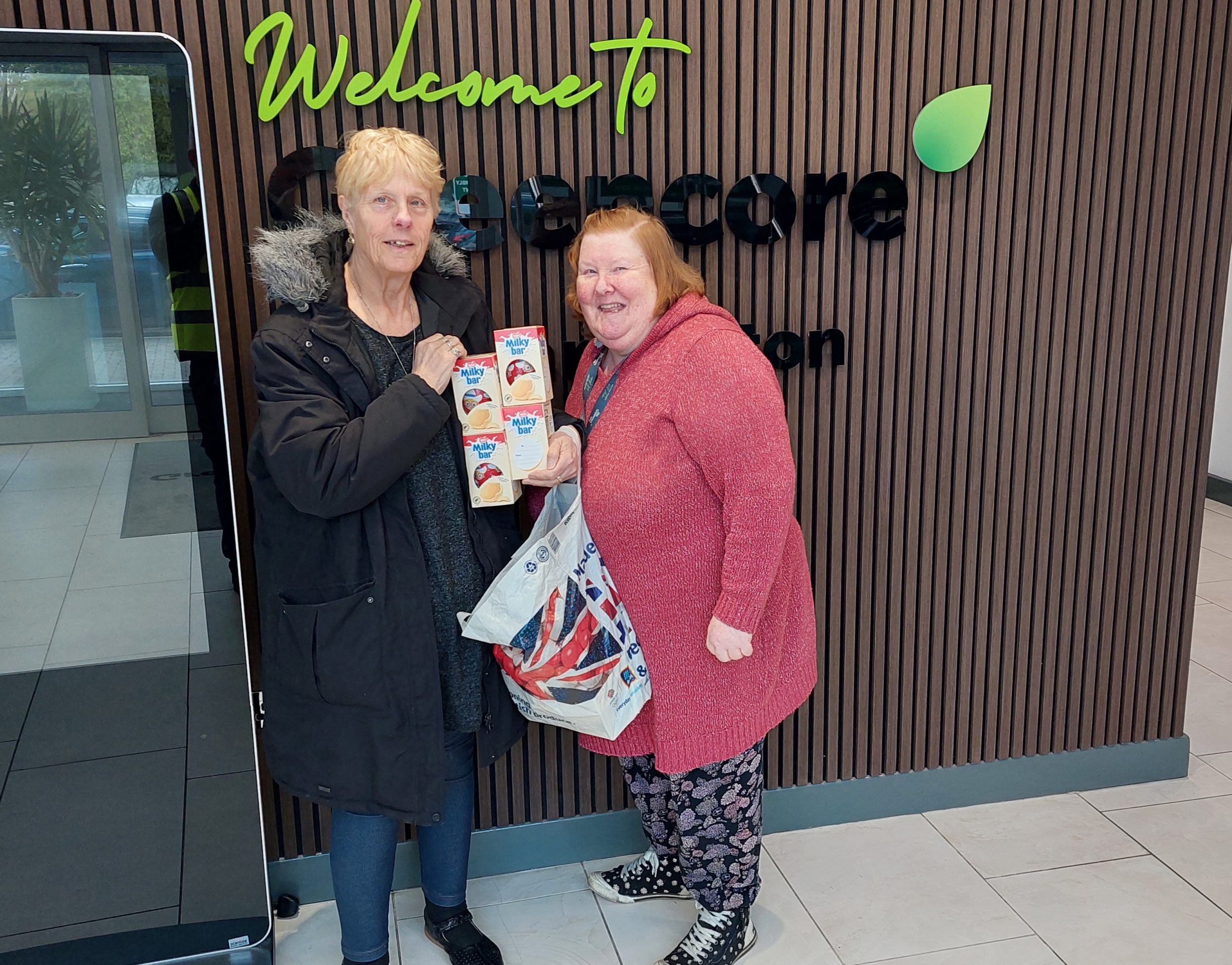 Poulton with Fearnhead Parish Council Chair, Sue Emery, collects Easter Eggs from Lynn Boyce Materials Planner at Greencore.